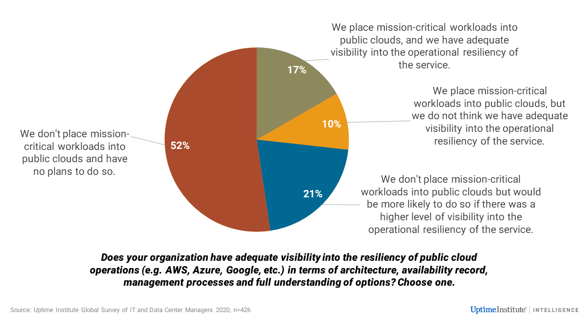 Uptime Institute believes that many mission-critical workloads are likely to remain in on-premises or colo data centers — at least for many years to come: More than 70% of IT and critical infrastructure operators we surveyed in 2020 do not put any critical workloads in a public cloud, with over a quarter of this group (21% of the total sample) saying the reason is a lack of visibility/accountability about resiliency. And over a third of those who do place critical applications in a public cloud also say they do not have enough visibility (see chart below). Clearly, providers’ assurances of availability and of adherence to best practices are not enough for mission-critical workloads. (These results were almost identical when we asked the same question in our 2019 annual survey.)