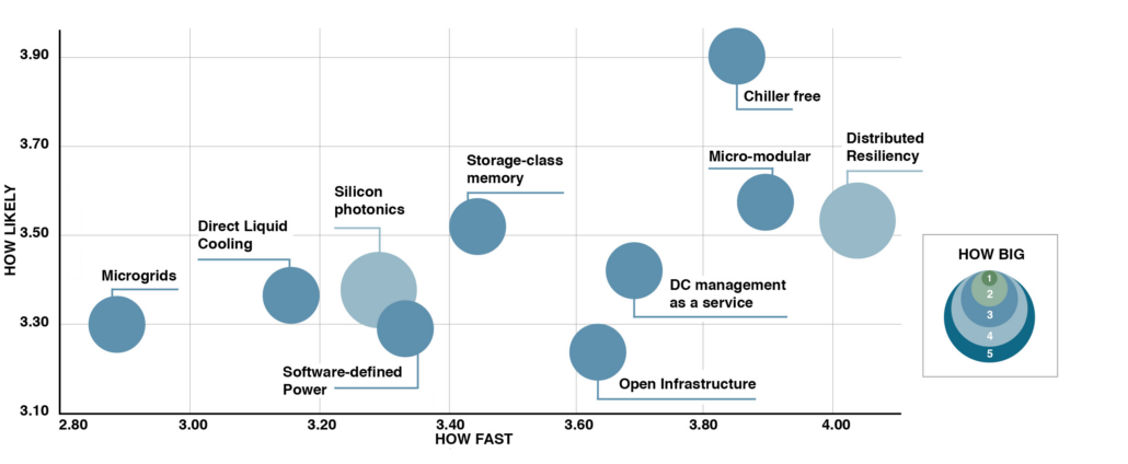 All of these technologies are complementary; all have been much discussed, sampled and tested for several years, but so far with limited adoption. Three of these four were identified as highly promising technologies in the Uptime Institute/451 Research Disrupted Data Center research project summarized in the report Disruptive Technologies in the Datacenter: 10 Technologies Driving a Wave of Change, published in 2017. As the disruption profile below shows, these technologies were clustered to the left of the timeline, meaning they were, at that time, not yet ready for widespread adoption.
