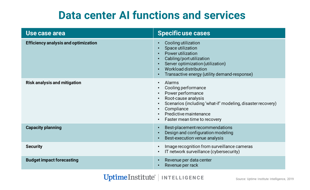 Today, however, AI is mostly being used in data centers to improve existing functions and processes. Use cases are focused on delivering tangible operational savings, such as cooling efficiency and alarm suppression/rationalization, as well as predicting known risks with greater accuracy than other technologies can offer.