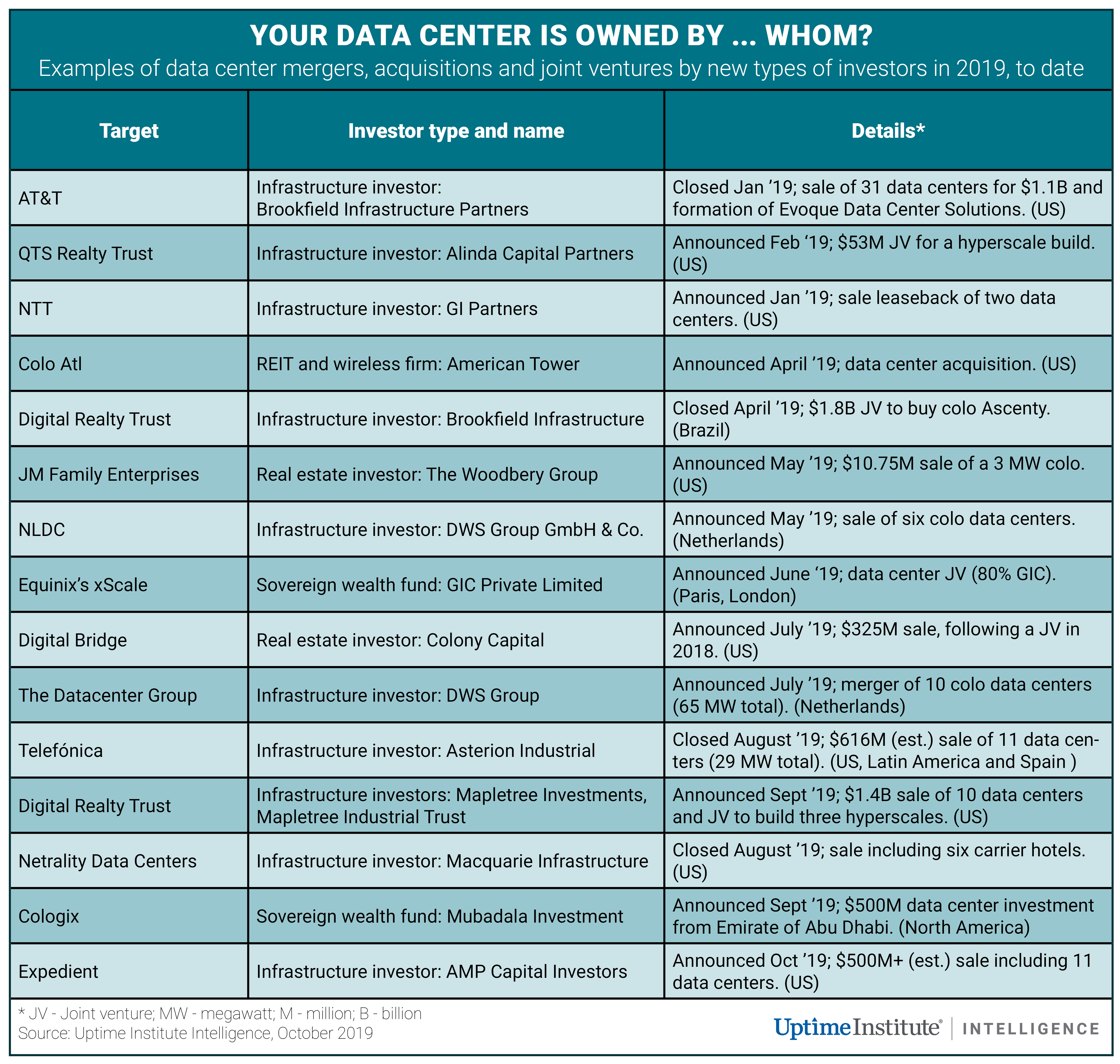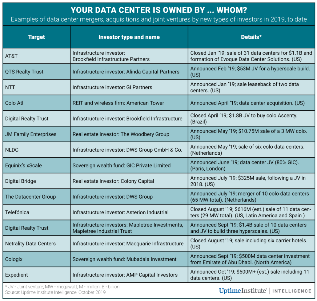 The table below highlights some of the non-traditional capital sources that acquired data centers in 2019.
