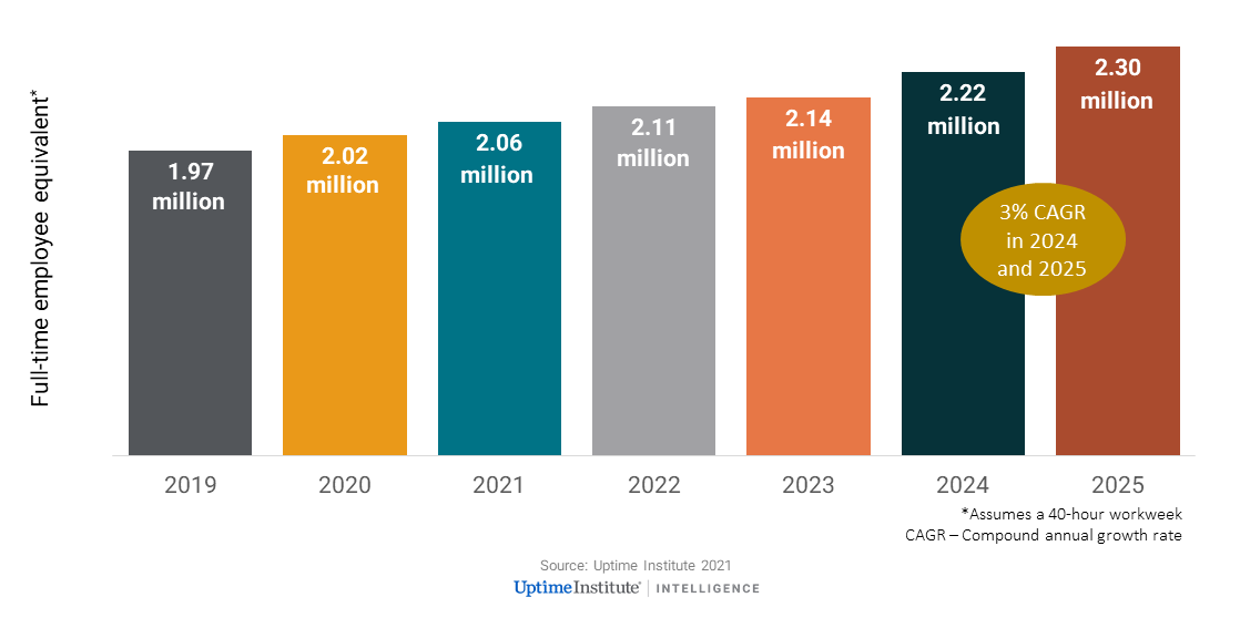 Uptime Institute forecasts global data center staff requirements will grow globally from about 2.0 million full-time employee equivalents in 2019 to nearly 2.3 million in 2025 (see Figure 1). This estimate, the sector’s first, covers more than 230 specialist job roles for different types and sizes of data centers, with varying criticality requirements, from design through operation.