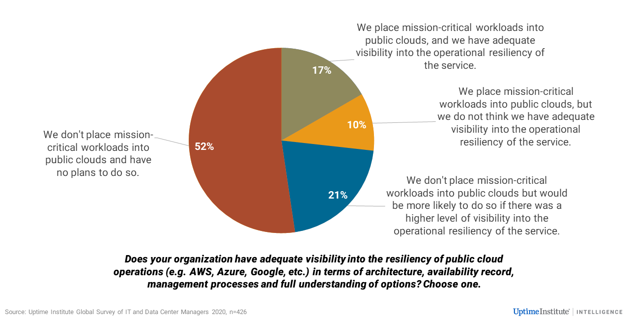 Unfortunately for the cloud companies, assurances of availability or of adherence to best practices are not enough. In both the 2019 and the latest 2020 global annual survey of IT and critical infrastructure operators, Uptime Institute asked respondents if they put mission-critical workloads into the cloud, and whether resiliency and visibility is an issue. The answers in each year are almost identical: Over 70% did not put any critical applications in the cloud, with a third of this group (21% of the total sample) saying the reason was a lack of visibility/accountability about resiliency. And one in six of those who do place applications in the public cloud also say they do not have enough visibility (see chart below).
