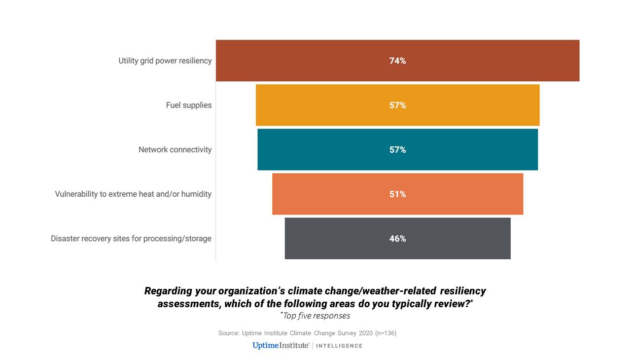 The figure below shows the top areas typically reviewed by organizations conducting climate change/weather-related data center resiliency assessments.