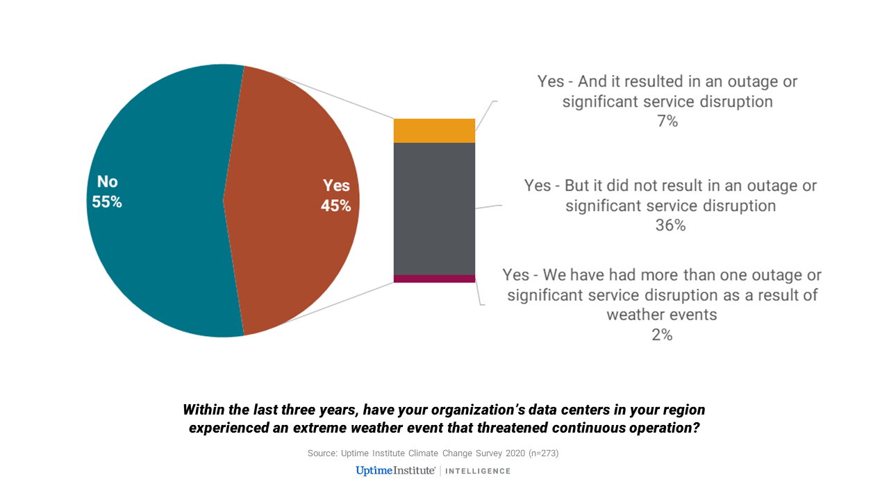 In a recent Uptime Intelligence survey, almost half (45%) of respondents said they had experienced an extreme weather event that threatened their continuous operation — a surprisingly large number. While most said operations continued without problems, nearly one in 10 respondents (8.8%) did suffer an outage or significant service disruption as a result. This makes extreme weather one of the top causes of outages or disruption.