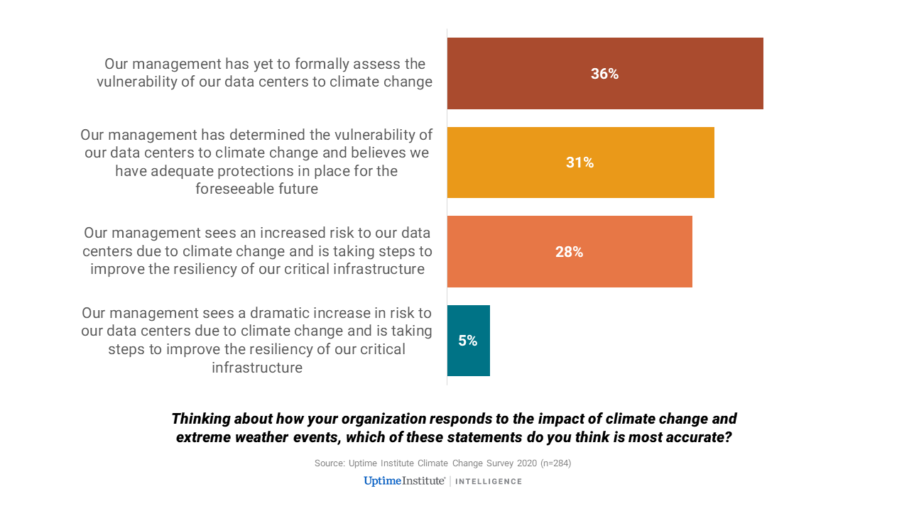 While most operators are very aware of the risks and costs of climate change, however, many do not appear to consider their own sites to be facing any immediate challenges. Over a third (36%) report their management has yet to formally assess the vulnerability of data centers to climate change. Almost a third (31%) believe they already have adequate protection in place — but it is not clear if this belief is backed by recent analysis.