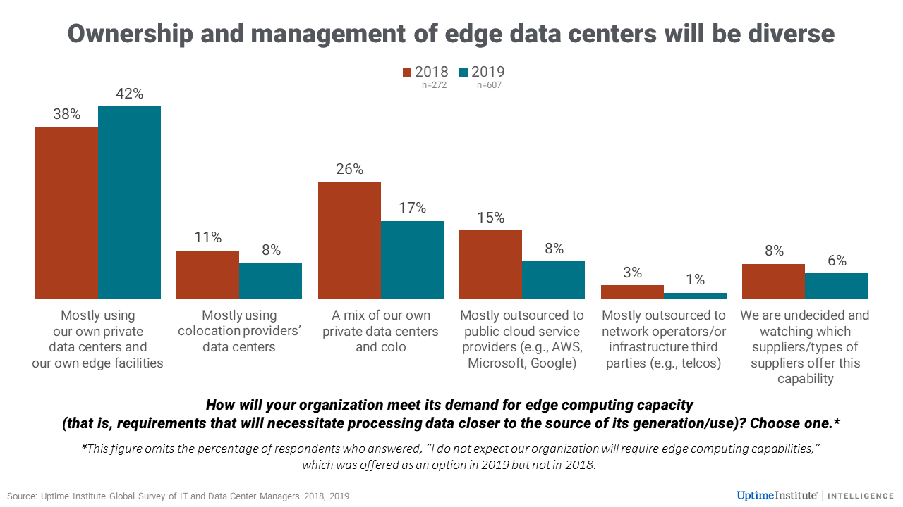 A third big issue that will slow demand for micro data centers is economic and organizational. These issues include licensing, location and ownership of sites; support and maintenance; security and resiliency concerns; and management sentiment. Most enterprises expect to own their own edge micro data centers, according to Uptime Intelligence research, but many others will likely prefer to outsource this altogether, in spite of potentially higher operational costs and a loss of control.