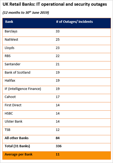 There may be certain mitigating factors relating to the retail banking figures: many of the banks are large and have multiple services, and some of the banks have common ownership or shared systems, so there may some “double counting” of underlying problems. And the data has grouped security incidents with IT availability problems, which has boosted the overall numbers.
