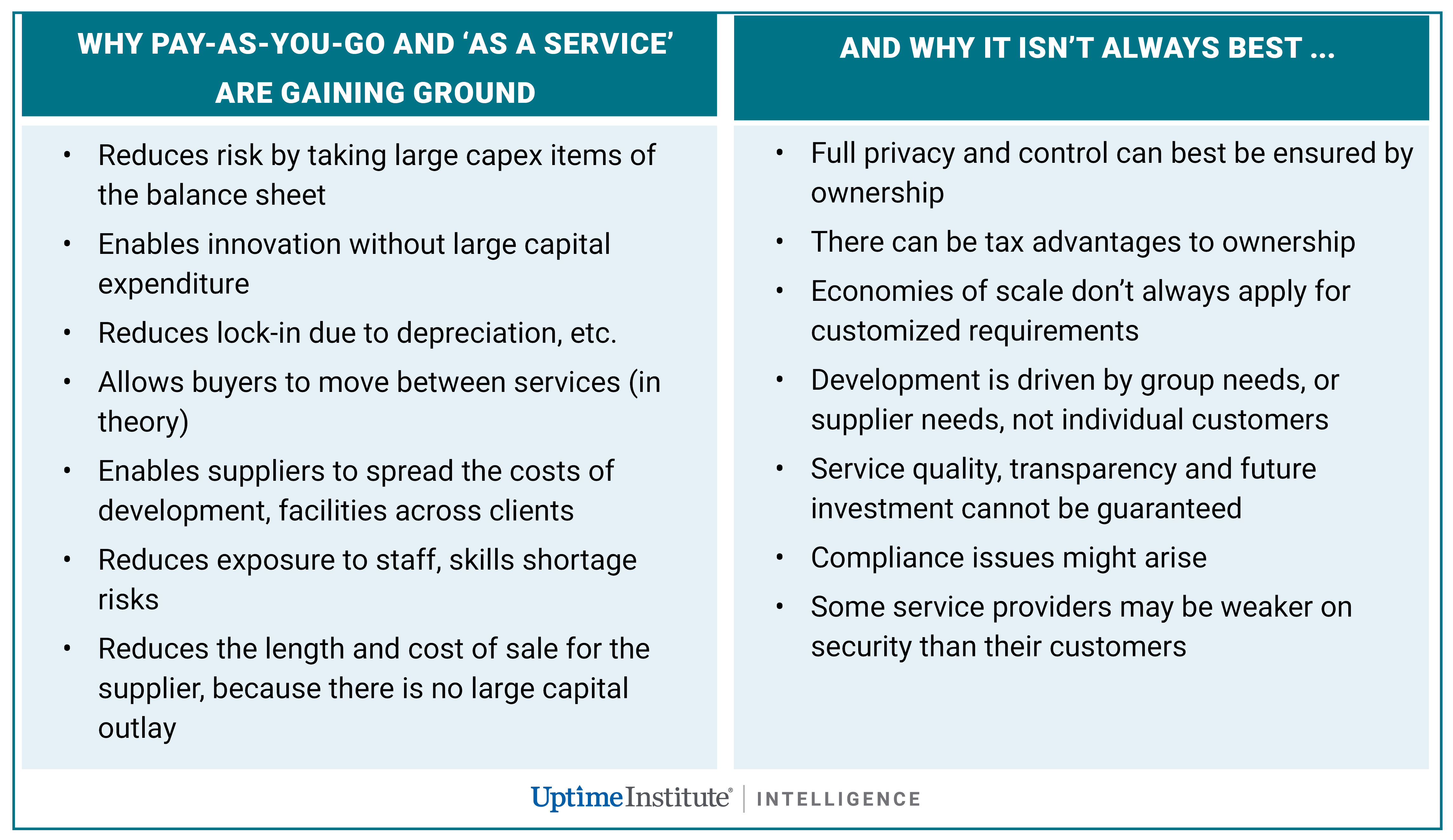 Energy backup and generation is another area to watch. Suppliers have introduced various pay-as-you-go models for their equipment. These include leased fuel cells owned by the supplier (notably Bloom Energy), which charges customers only for the energy produced. By eliminating the client’s risk and capital outlay, it can make the supplier’s sale easier (although they have to wait to be paid). Some suppliers have ventured in UPS-aaS, but with limited success to date.