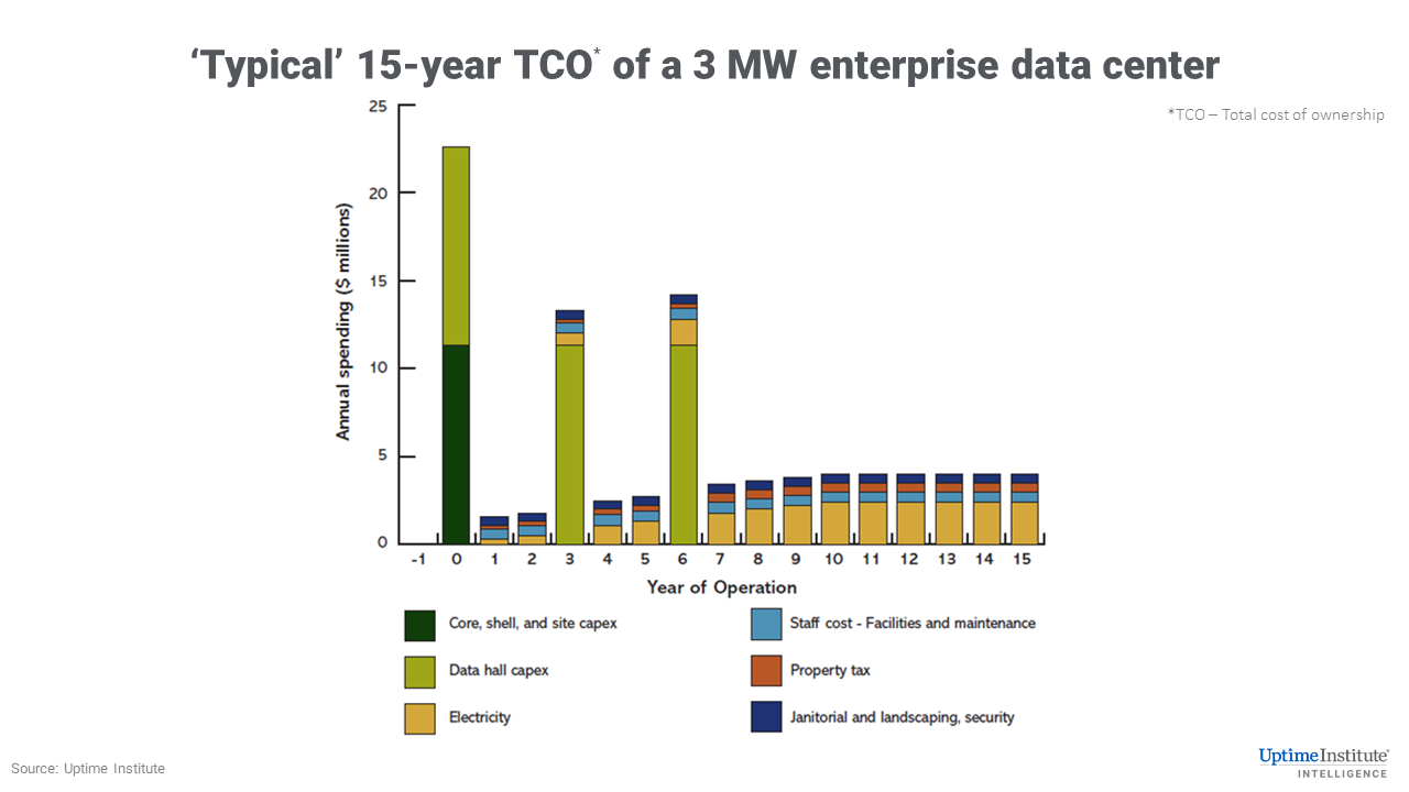 Many organizations have now come to view data center ownership as a big capital risk — one that only some want to take. Even when it’s cheaper to deliver IT from their own “on-premises” data center, the risks of data center early obsolescence, under-utilization, technical noncompliance or unexpected technological or local problems are all factors. And, of course, most businesses want to avoid a big capital outlay: Our research shows that, in 2017, the total cost of ownership of an “average” concurrently maintainable 3 megawatt (MW) enterprise data center amortized over 15 years was about $90 million, and that roughly half of the cost is invested in three installments over the first six years, assuming a typical phased build and bricks-and-mortar construction.