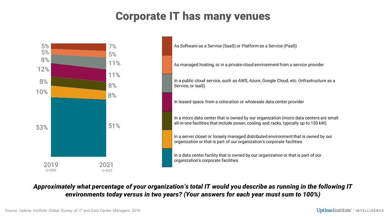 While more enterprise IT is moving to colos and managed services (whether or not it is cloud), enterprise data centers will not disappear. More than 600 IT and data center managers told Uptime Institute that, in 2021, about half of all workloads will still be in enterprise data centers, and only 18% of workloads in public cloud/SaaS.