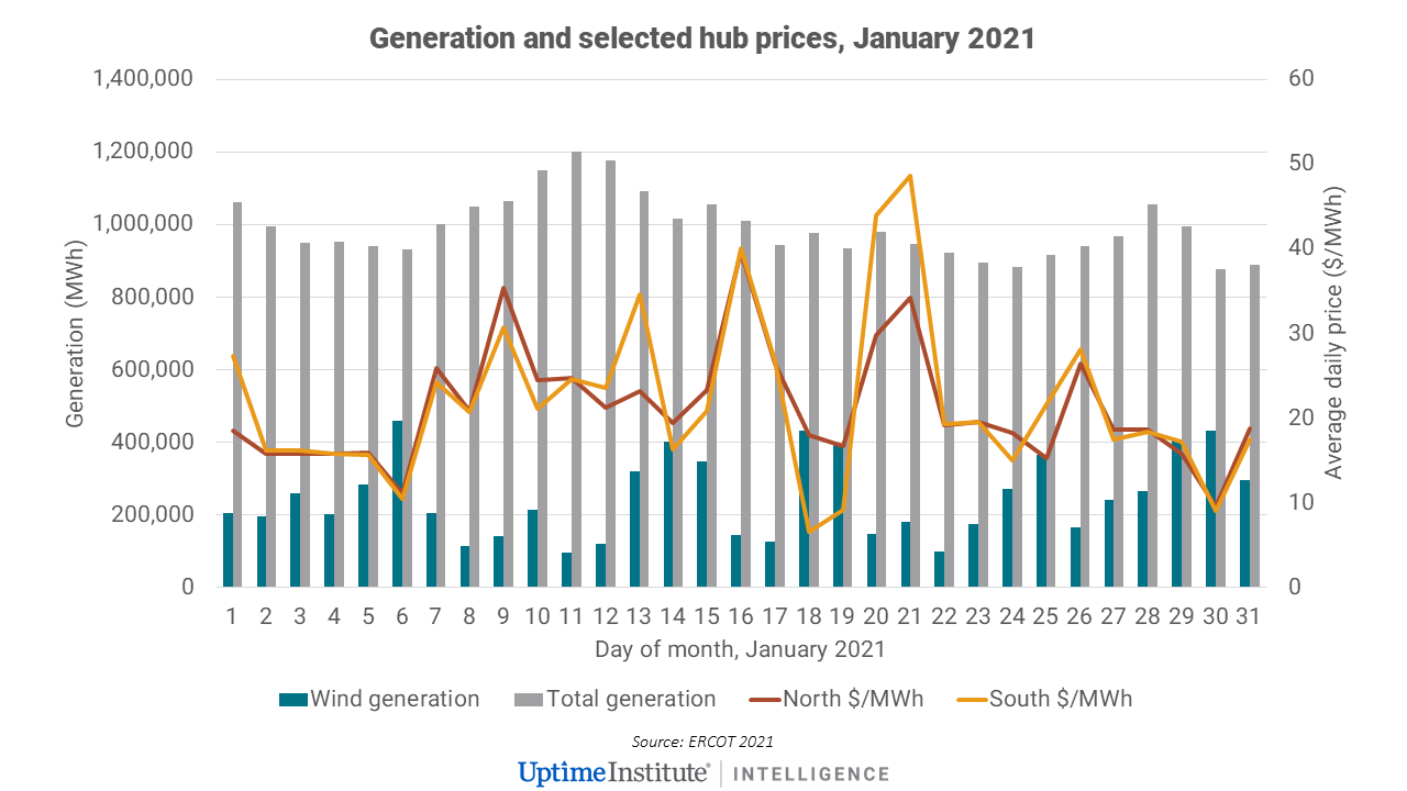 This does happen: Currently, PPAs signed in the Texas ERCOT region in 2016 are generating losses for their purchasers. Figure 1 illustrates how higher average available wind generation capacity (bars) reduced the daily average spot market prices at two settlement hubs (lines) during January 2021.