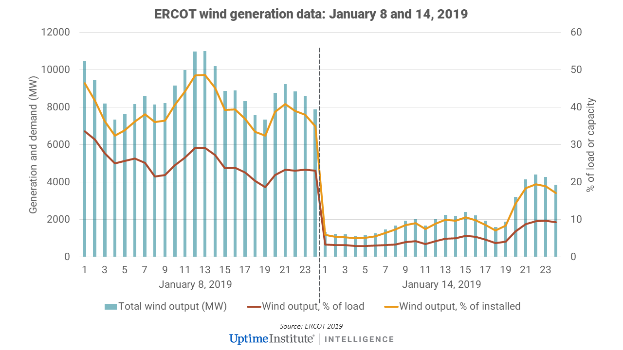 Reliability. As intermittent renewable capacity increases it reduces the percentage of time fossil fuel and nuclear generation sources are dispatched to the grid, reducing their revenues. While the delivery of renewably generated energy has increased, it still varies significantly from hour to hour. In ERCOT in 2019, there were 63 hours where wind satisfied more than 50% of demand and 602 hours where it supplied less than 5%. Figure 2 provides an example of wind generation variability over two days in January 2019 in the ERCOT area. On January 8, the available wind generation capacity averaged roughly 8 gigawatts (GWs), satisfying approximately 25% of the demand. On January 14, the output was significantly reduced at 2 GWs, satisfying approximately 10% of demand.